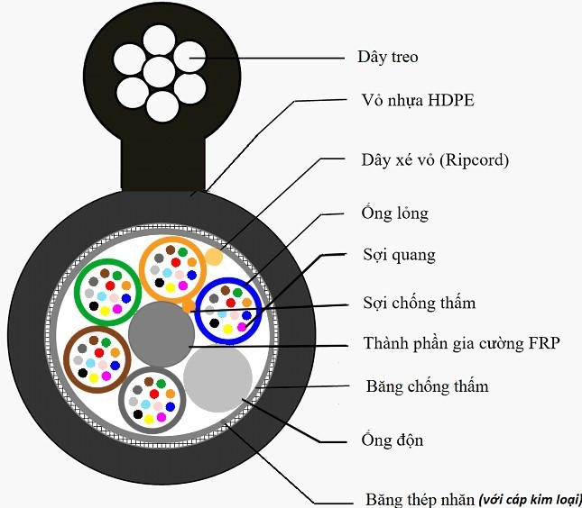 Cáp quang treo kim loại 72 FO TBD hình số 8 có lớp bọc kim loại chống gặm nhấm có dây treo kim loại