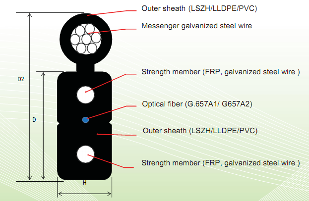 - Self-supporting FTTH drop cable is constructed with from one to four single-mode fibers (G.657A1). The cable is protected by a dielectic strength member, suitable for direct aerial outdoor installation of FTTH network;